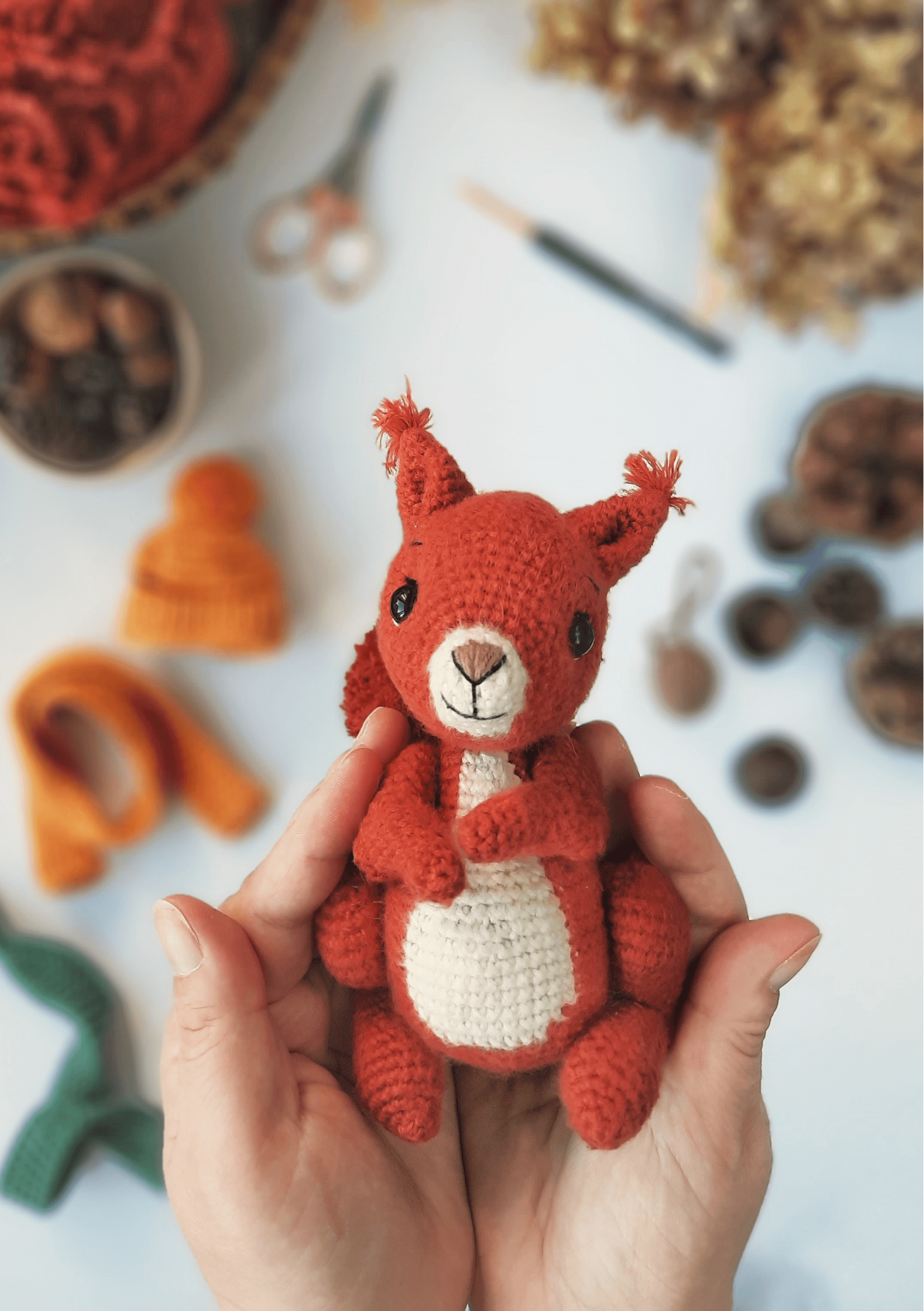 Kurs Wiewiórka Basia to już zaawansowany poziom szydełkowania maskotek. Pokażę Ci w nim wiele nowych technik, które rozświetlą Ci drogę do dalszego rozwoju w tworzeniu. Na początek dowiesz się jak kształtować robótkę nie tylko oczkami ścisłymi, ale przy główce podpowiem jak to zrobić przy pomocy włóczki. Tak żeby oczka naszej Wiewióreczki nabrały jeszcze słodszego wyrazu. Wyszyjemy oczywiście też nosek i szczegóły oczek i dowiesz się jeszcze jak zrobić takie frędzelki przy uszkach.