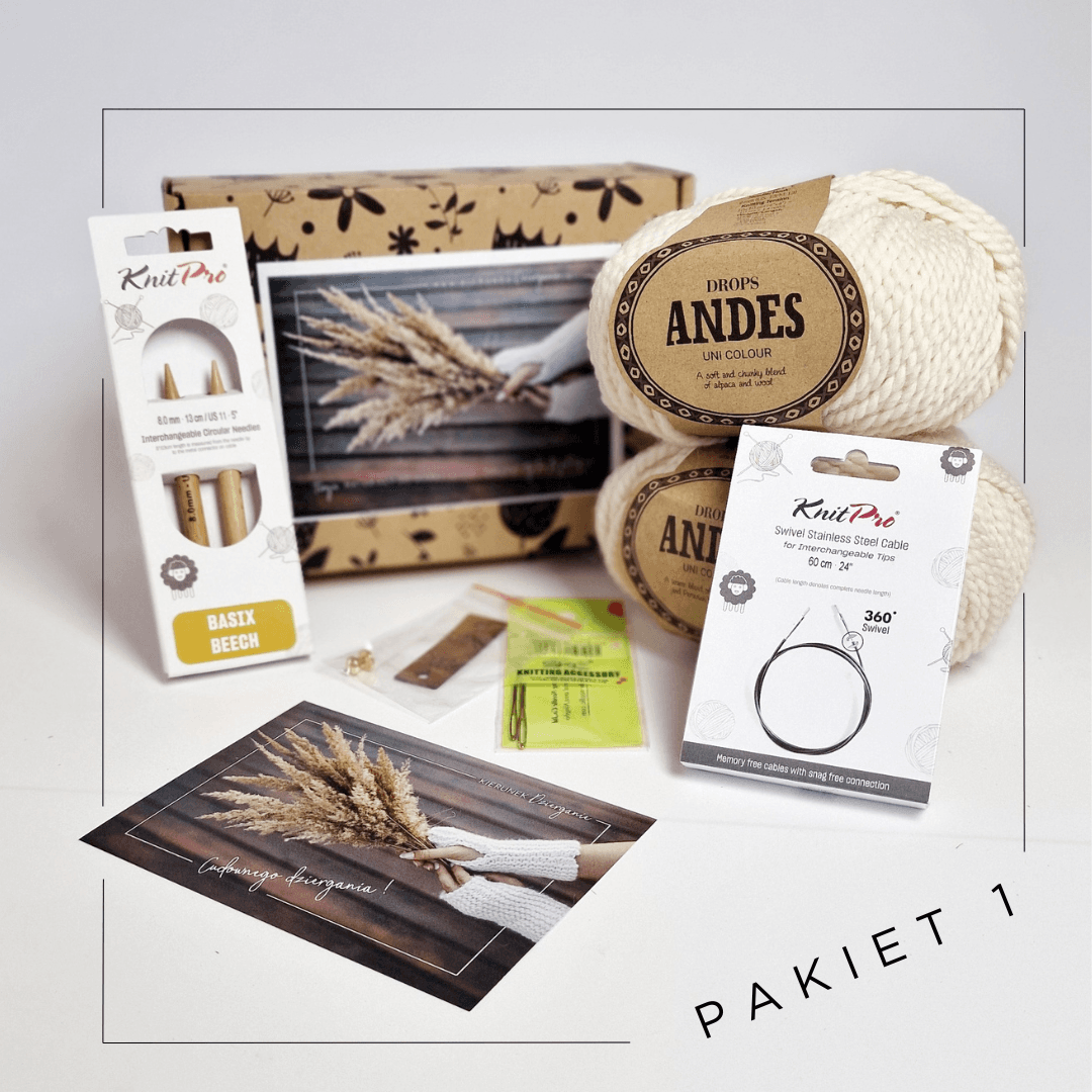 PAKIET 1: podstawowy dzięki któremu wykonasz projekty w pierwszym tygodniu warsztatów czyli mitenki i opaskę. To wresja dla tych, którzy nie są pewni czy pokochają dzierganie i wolą najpierw spróbować.