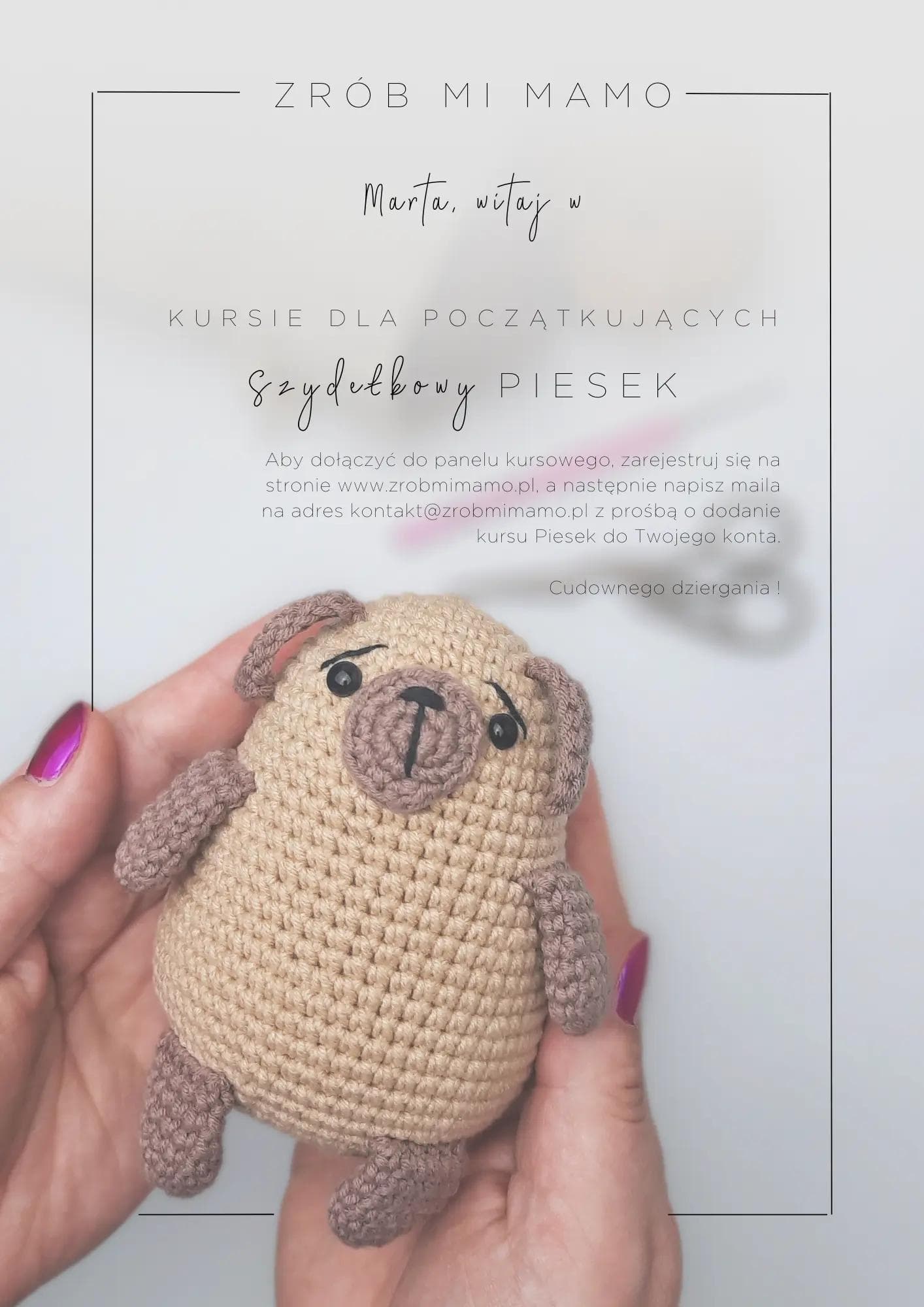 Tutaj zakupujesz Voucher w formie PDF na kurs Szydełkowy Piesek. W razie pytań lub wątpliwości, napisz do mnie proszę na kontakt@zrobmimamo.pl :)