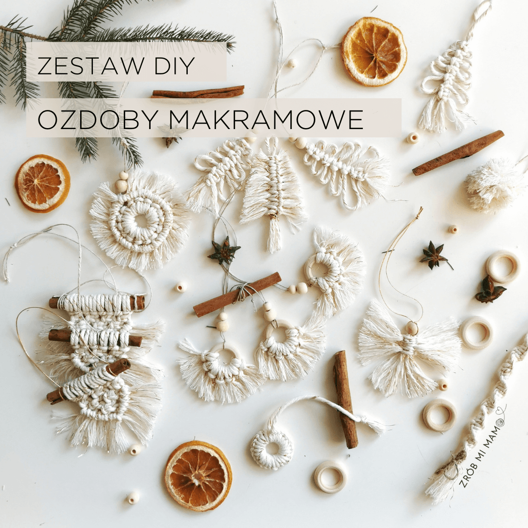 Makramowy Zestaw Świąteczny zawiera wszystko co niezbędne, aby wykonać te świąteczne ozdoby.