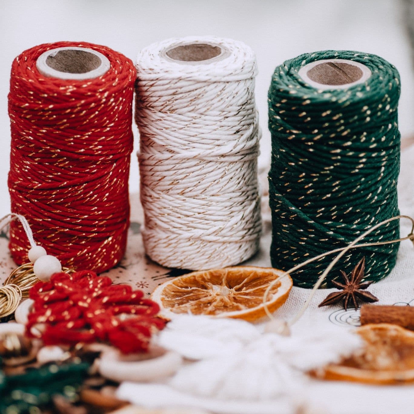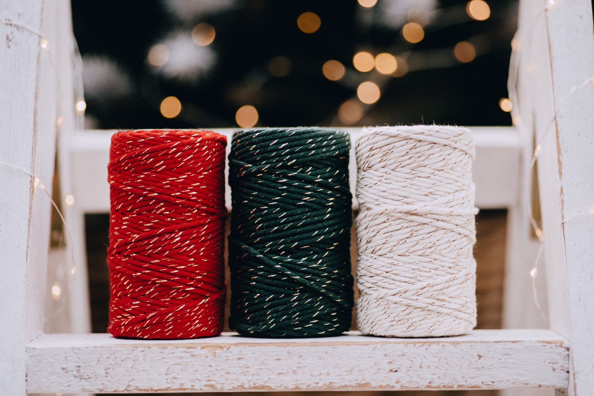- 3 sznurki ze złotą nicią 2mm: 1 w kolorze ecru, 1 czerwony i 1 zielony,